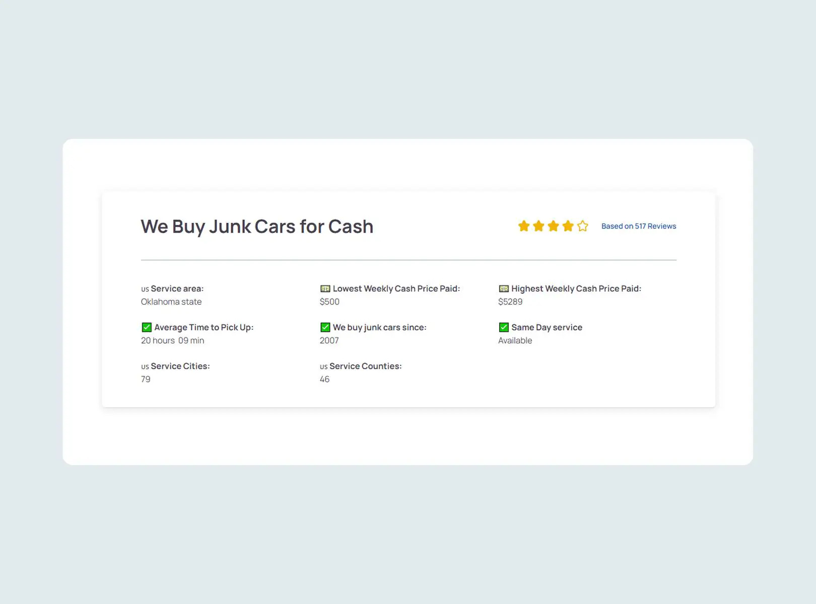 На каждой странице есть раздел с рейтингом в виде звезд, который помогает пользователям оценивать качество сервиса. Специальная микроразметка в разделе позволяет отображать рейтинг в результатах поиска, что существенно повышает кликабельность (CTR).