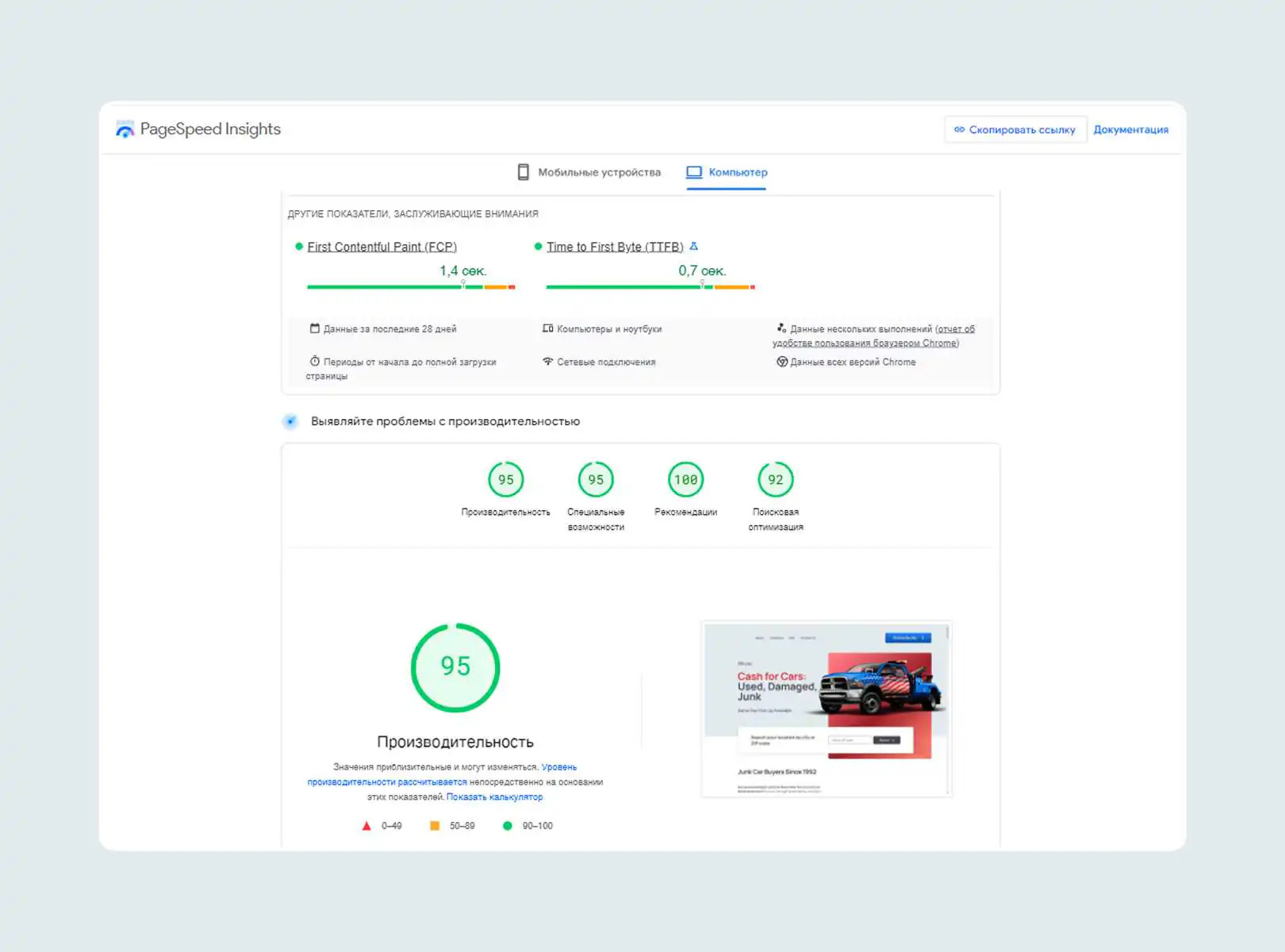 После этой доработки сайт продемонстрировал высокие показатели в Google PageSpeed, что положительно повлияло на пользовательский опыт и SEO.
